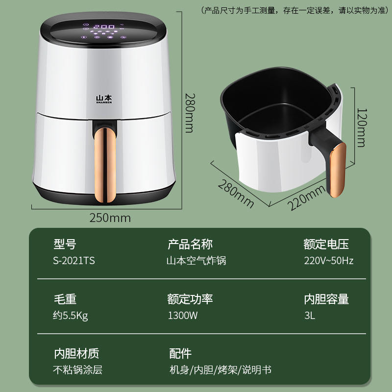 山本空气炸锅家用3.0升智能液晶炸锅2021ts【PP/白色】 |