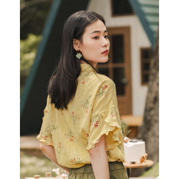 茵曼秋装新款素雅印花中袖衬衣翻领宽松显瘦木耳边袖口衬衫女 阳光黄 S |