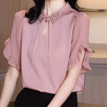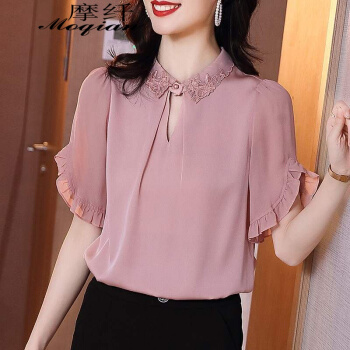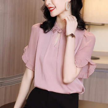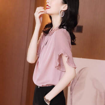 摩纤衬衫雪纺衫女仿 真丝夏季新款时尚气质纯色显瘦五分袖衬衫 粉色 S【建议95斤以内】 |