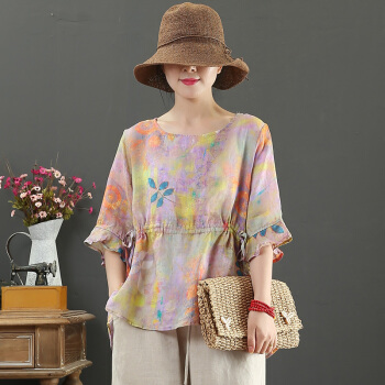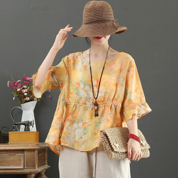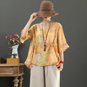 龙芝美 短袖衬衫女夏季新款棉麻女装文艺印花荷叶袖五分袖短款衬衣 L1-XJMC038-7133-黄色 L |