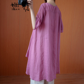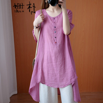 姗朴 棉麻衬衫女民族风夏季新款文艺复古大码女装宽松显瘦中长款不规则衬衫裙遮肚减龄衬衣小衫上衣 粉色 大码L【建议130斤以下】 |
