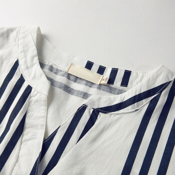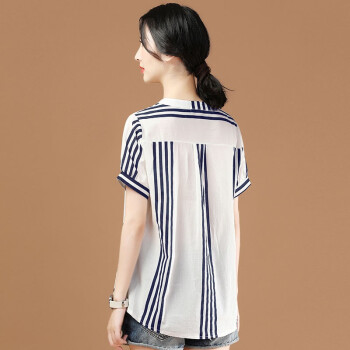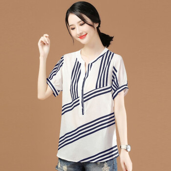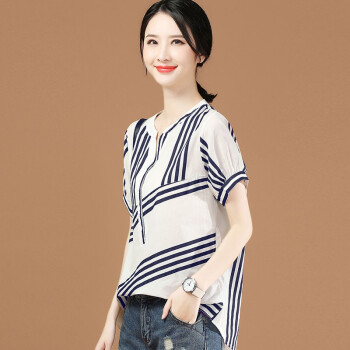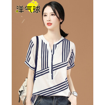 洋气球衬衫女夏季新品韩版设计感小众轻熟条纹女衬衫宽松V领短袖拼接薄款套头女上衣8349 藏蓝条 请拍正确尺码 |