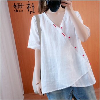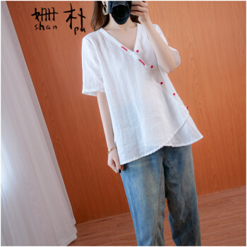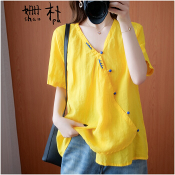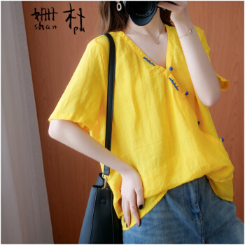 姗朴 棉麻衬衫女民族风夏季新款文艺复古大码女装胖mmV领盘扣宽松显瘦斜襟休闲短袖T恤上衣女 黄色 大码均码 |