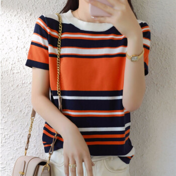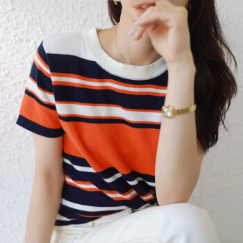 凝拉短袖T恤女纯棉夏季新款女装上衣韩版时尚气质宽松大码显瘦圆领拼色条纹针织打底小衫 条纹 2XL(建议130-145斤) |