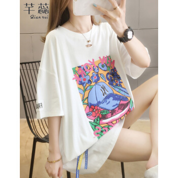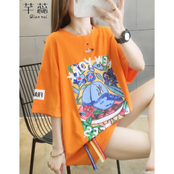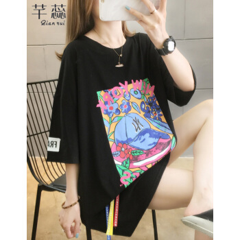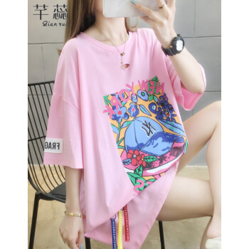 芊蕊短袖t恤女新款时尚韩版印花圆领中长款宽松大码女装胖MM半袖打底上衣服ins潮 粉红色 M |