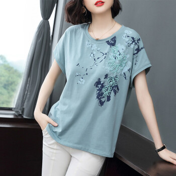 【精选好货】晞薇夏装新款年棉女装立体花朵拼接图案碎花短袖T恤女上衣大码中年妈妈半袖t桖夏 豆绿 M |