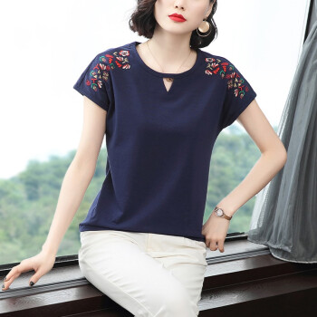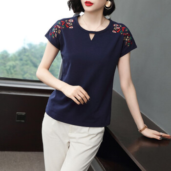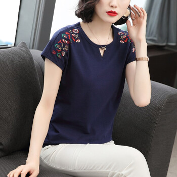 【精选好货】晞薇棉短袖t恤女新款夏季时尚显瘦碎花半袖上衣宽松刺绣中年妈妈女装t桖 深蓝色 请拍正确尺码 |