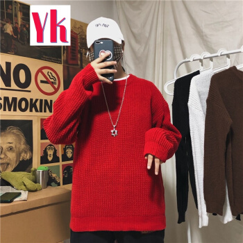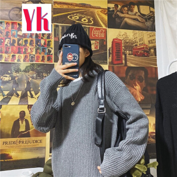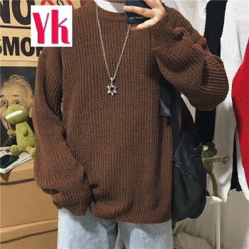 港风潮流ins慵懒风毛线衣情侣纯色圆领针织衫韩版宽松学生毛衣男 黑色 M |