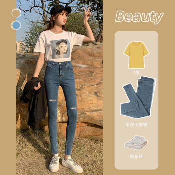 得听牛仔裤女秋季新款韩版修身弹力显瘦显高春秋季黑色紧身九分小脚破洞高腰牛仔裤 (常规款)复古蓝 27(86-95斤) |