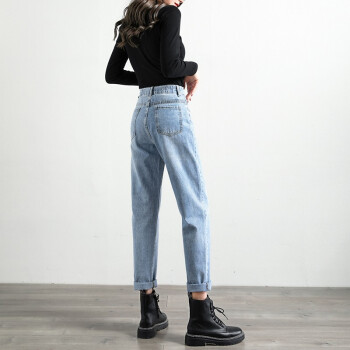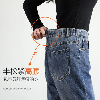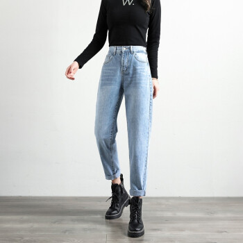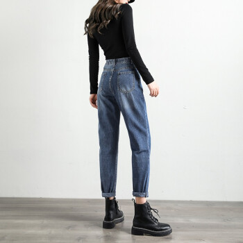 麦潮尚秋季新款松紧腰牛仔裤女高腰橡筋老爹裤显瘦哈伦裤子 复古蓝色 XXS建议70斤内 |
