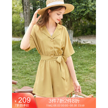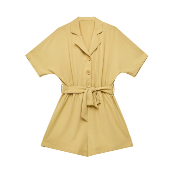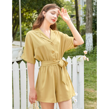 三彩夏季新款西装领松紧腰腰带宽松短袖连体裤短裤连衣裤女 黄色 160/84A/M |