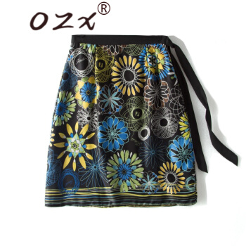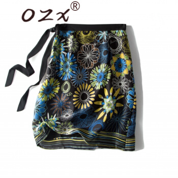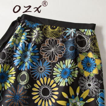 O.Z.X轻奢原创女装真丝半身裙女夏新款系带蝴蝶花复古印花桑蚕丝高腰百搭A字裙 黑底印花 L |