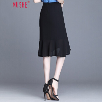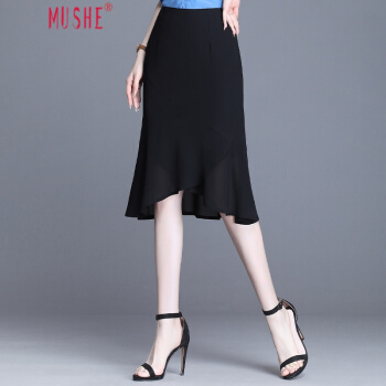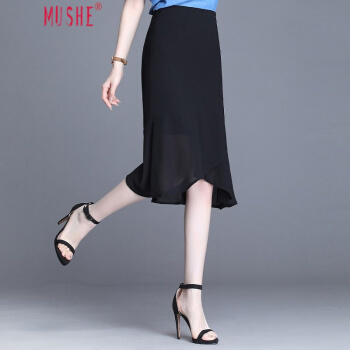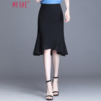 MUSHE轻奢原创女装 中长款纯色半身裙女夏季新款时尚名媛优雅减龄高腰不规则包臀鱼尾裙 黑色 21/L |