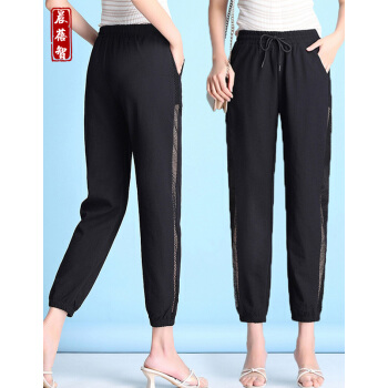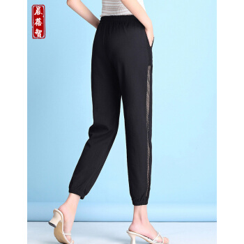 晨蓓智cbz休闲裤女夏季冰丝棉麻网纱拼接宽松大码女装百搭哈伦裤高腰九分运动小脚裤显瘦薄款 黑色 M【建议85-103斤】 |