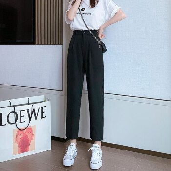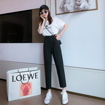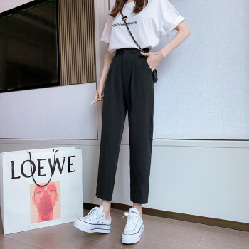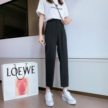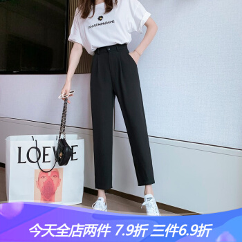 沫澜仟衣高腰显瘦休闲裤女夏季薄款韩版宽松直筒时尚百搭女士裤子轻薄透气九分裤子女外穿 黑色 2XL |