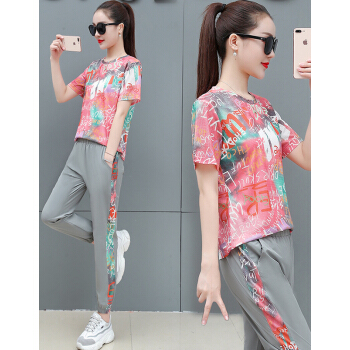婪澈休闲裤女女装夏季新款宽松韩版潮流短袖长裤印花显瘦洋气两件套套装女 蓝色 请下正确尺码 |