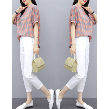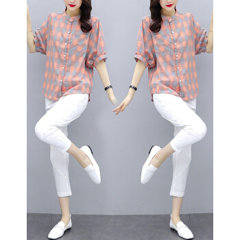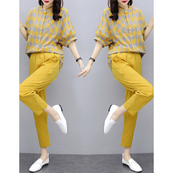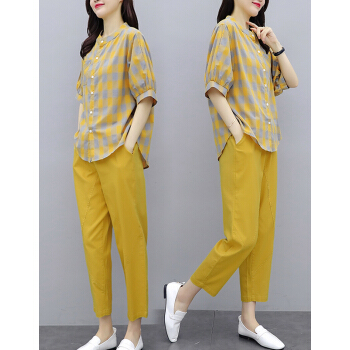 婪澈休闲裤女女装夏天新款宽松流行格子中袖休闲棉麻裤子两件套套装女 黄色 请下正确尺码 |