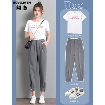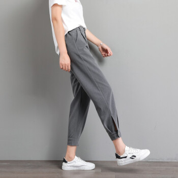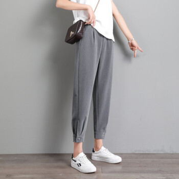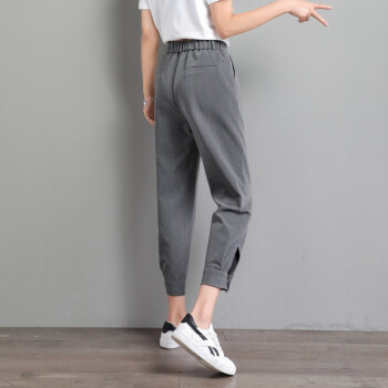 阔恋冰丝休闲裤女夏季薄款束脚西装裤新品直筒宽松高腰哈伦裤子百搭显瘦九分裤韩版松紧腰萝卜女裤 灰色 M |