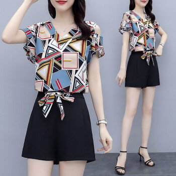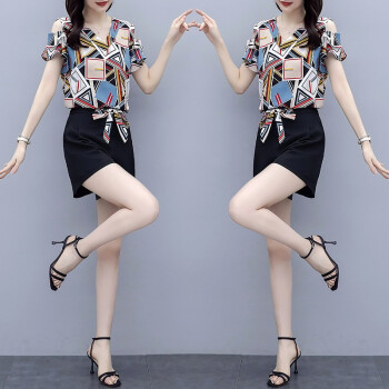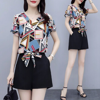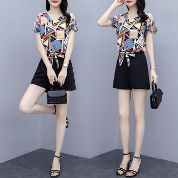 睡妍 短裤套装女夏装新款韩版休闲时尚女装大码显瘦时尚洋气印花短袖雪纺上衣短裤套装两件套女夏 图色 XL |