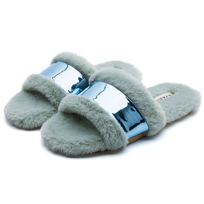 时尚亮片毛绒开口外穿毛拖鞋【短毛绒/浅绿】 |