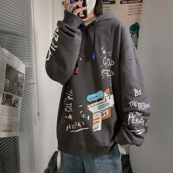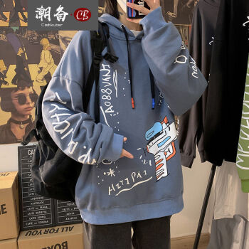 潮备 街头潮牌宽松嘻哈卫衣男士连帽衫青少年韩版秋季新款情侣原宿百搭外套 牛仔蓝 M |