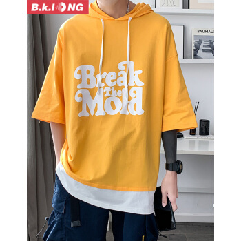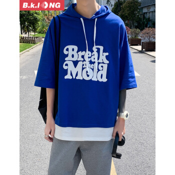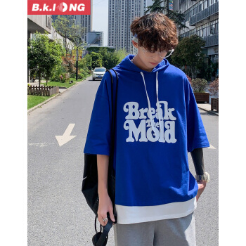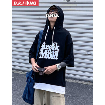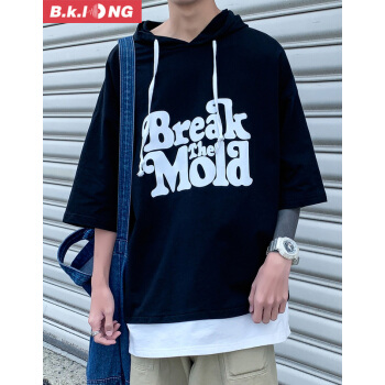 短袖卫衣男巴克龙夏季新款港风宽松薄款短袖连帽T恤假两件韩版潮流时尚休闲百搭小清新 黑色 XL |