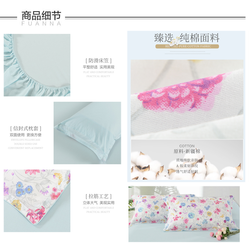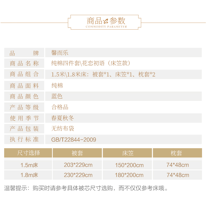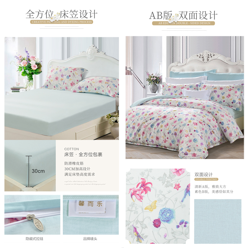花恋初语 床笠四件套(被套1件床笠1件枕套2件)(适合1.8米床)【纯棉/蓝】 |