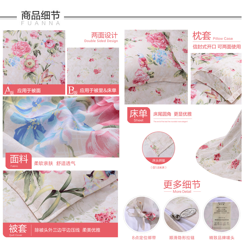 芬芳花意 床单四件套(被套1件床单1件枕套2件)(适合1.5米床)【纯棉/粉】 |