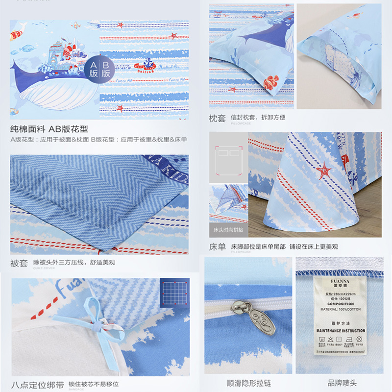海洋奇遇记 床单四件套(被套1件床单1件枕套2件)(适合1.5米床)【纯棉/蓝】 |