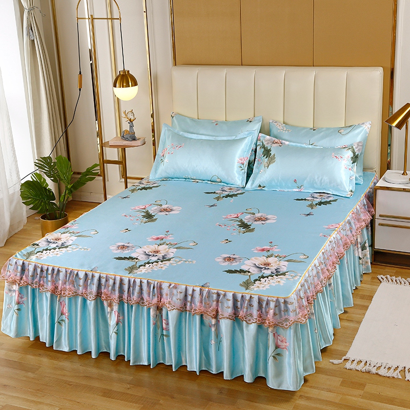 印花蕾丝床裙款冰丝席凉席三件套【冰丝(聚酯纤维)/花叶情深-兰】 |