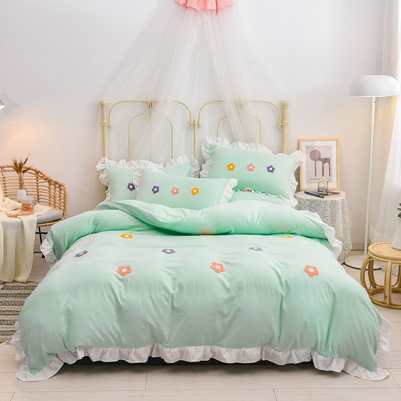 【锦软贴身】泫雅花毛巾绣荷叶边四件套【聚酯纤维/泫雅花-水绿】 |
