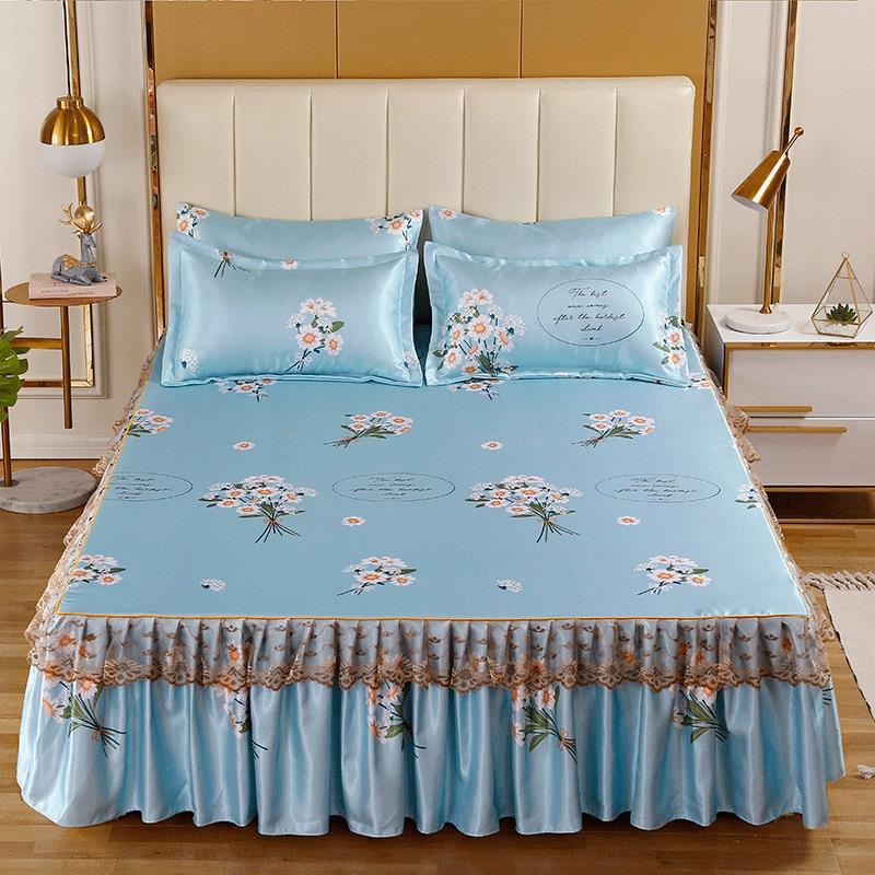 印花蕾丝床裙款冰丝席凉席三件套【冰丝(聚酯纤维)/朵菲雅-兰】 |