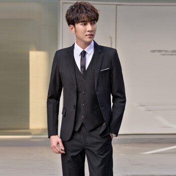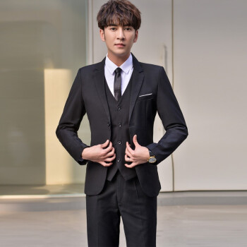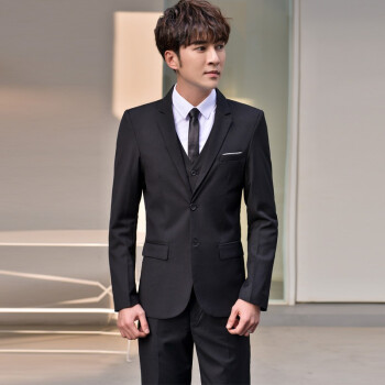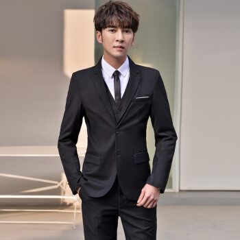 vocaco西服套装男修身三件套青年正装上班面试职业装学生青少年韩版潮流黑色新郎结婚礼服外套商务休闲 两粒扣黑色西服+西裤+白衬衫+领带 L/106-119斤 |