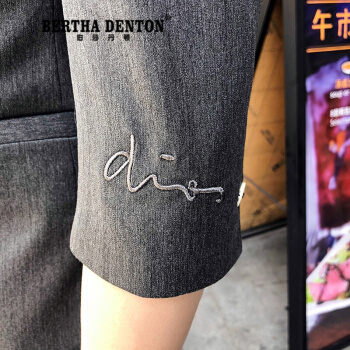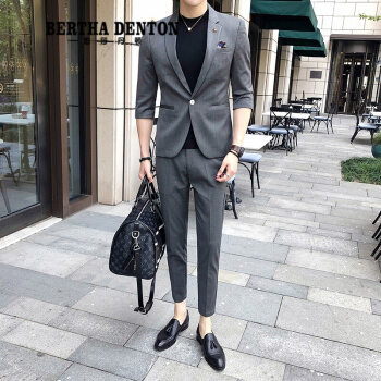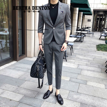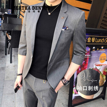 伯莎丹顿品牌夏季短袖痞帅小西装男外套新款修身垂感刺绣一套西服潮 中灰色【西装+西裤+黑色T恤】 XL |