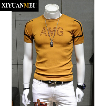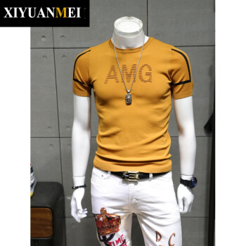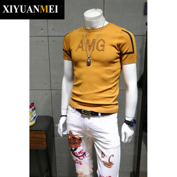 西原美潮牌 短袖毛衣男士 夏季韩版简约刺绣圆领修身打底针织衫男FD-FD-2250 黄色 180/92A |
