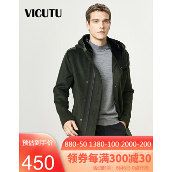威可多VICUTU秋冬风衣男中长款连帽纯羊毛保暖修身毛呢大衣外套VRS16342848 军绿色 175/92A/L |