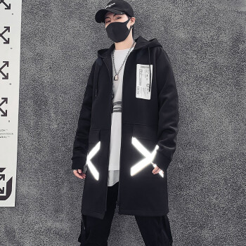 巴克龙秋冬新款连帽风衣男中长款韩版宽松港仔文艺男港风工装风衣青少年学生反光条外套加肥大码青年原创设计 黑色 M |