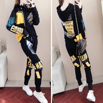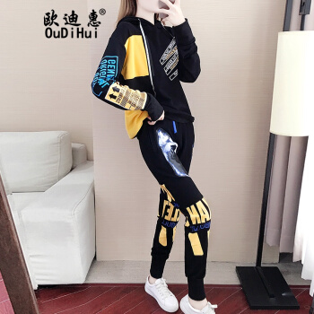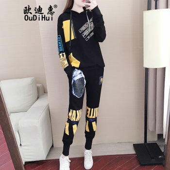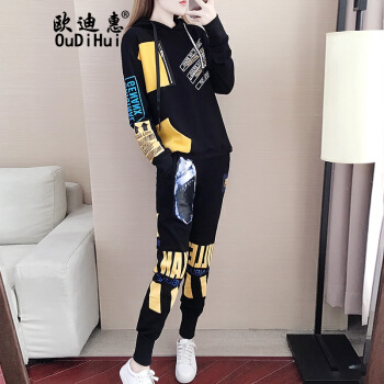 欧迪惠 卫衣女学生新款韩版春秋季运动套装女宽松个性时尚气质连帽上衣女休闲两件套潮 黑色套装 M |