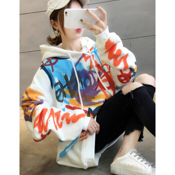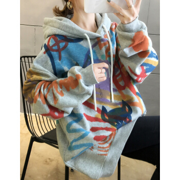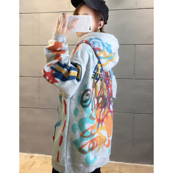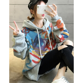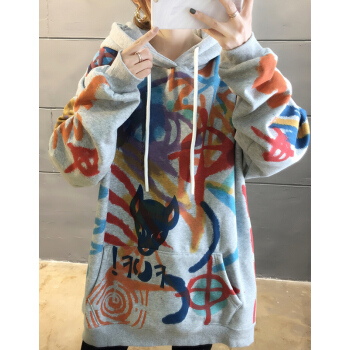 时尚欧陆 卫衣女宽松连帽中长款女士上衣潮春秋时尚套头韩版慵懒风印花学生款长袖嘻哈少女短外套 灰色 L |