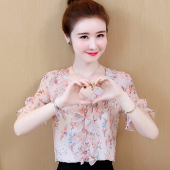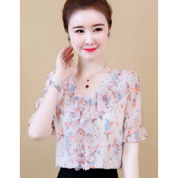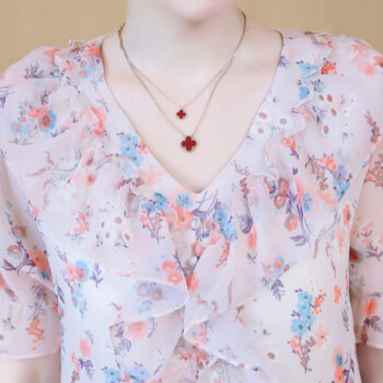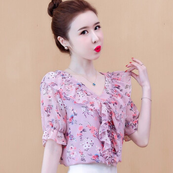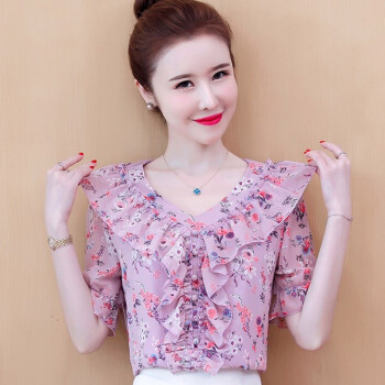 心莉美 雪纺衫女夏装新款v领荷叶边雪纺衬衫短显瘦洋气碎花衬衫女上衣潮 花色 L |