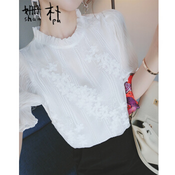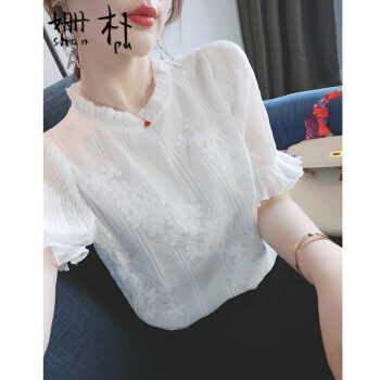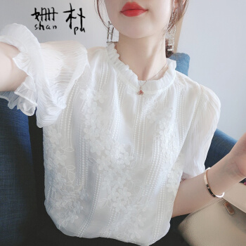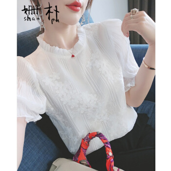 姗朴 雪纺衫女韩版夏季新款蕾丝刺绣衬衫女宽松显瘦洋气木耳边打底衫超仙上衣短袖立领荷叶袖蕾丝衫 白色 L |