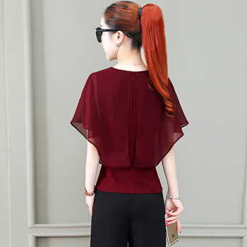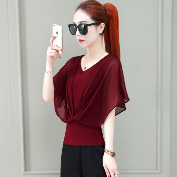 南极人 短袖雪纺衫女夏季新款女装韩版时尚百搭宽松显瘦网纱上衣V领小衫 N7-GTCF03-7036-酒红色 M |