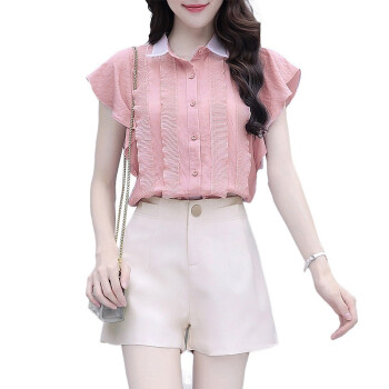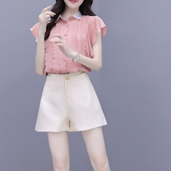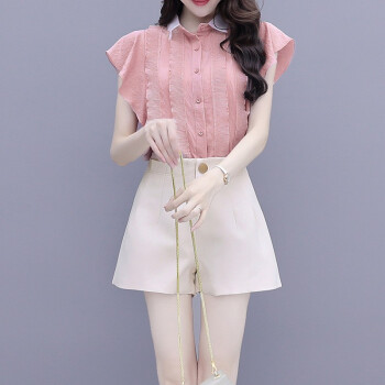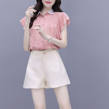 灏尼欧 雪纺衫套装女夏装新款小个子显高洋气减龄休闲短裤子两件套 粉色套装 M |