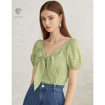 范思蓝恩 夏季新款复古泡泡袖雪纺衫女设计感小众胸前绑带上衣 青格纹 L |