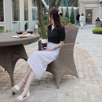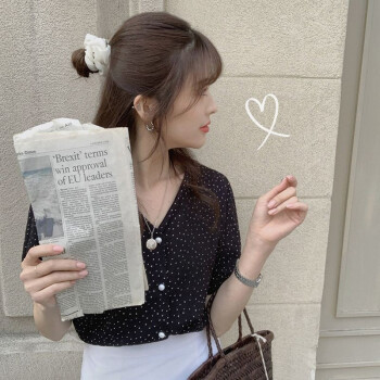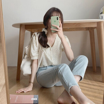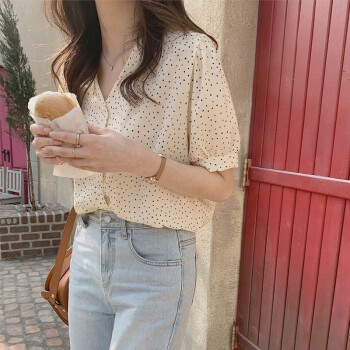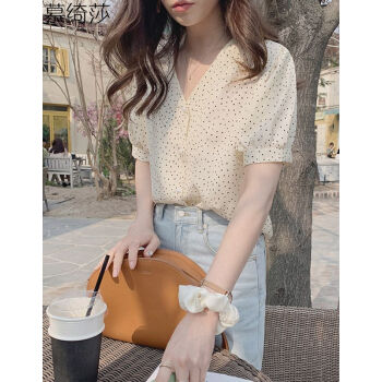 慕绮莎 雪纺衫女夏季新款波点短袖v领纽扣气质高档洋气小衫港风复古上衣 米杏色 S |