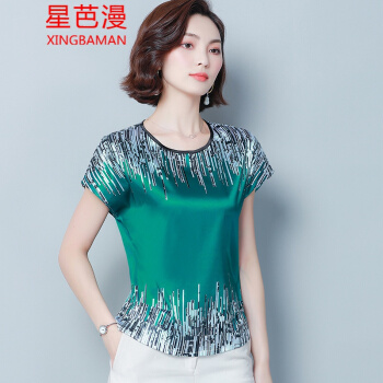 星芭漫 雪纺衫T恤女新款夏宽松短袖装圆领印花上衣显瘦#8051 绿色 L |