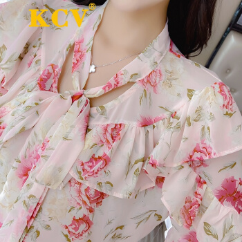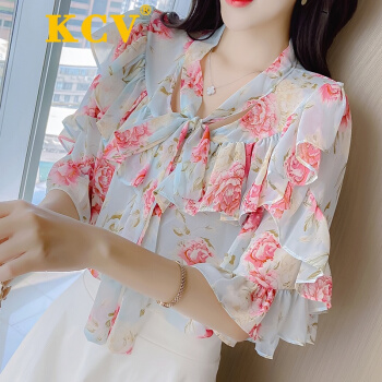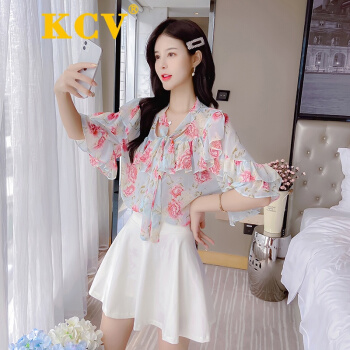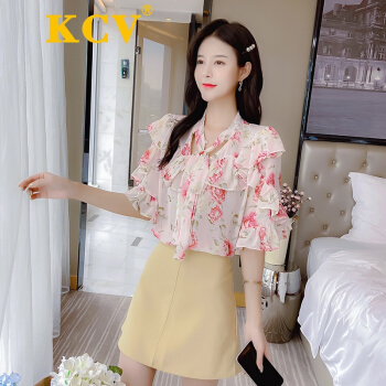 KCV 香港潮牌轻熟碎花雪纺衫女短袖上衣夏季荷叶边很仙的洋气小衫超仙温柔衬衫 浅蓝色 S |