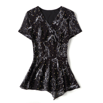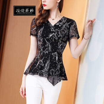 拉伦菲韵 意式高端品牌女装 短袖碎花雪纺衫夏装法式复古洋气百搭修身显瘦收腰V领上衣潮 黑色 L |