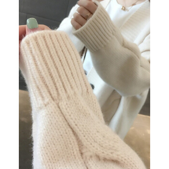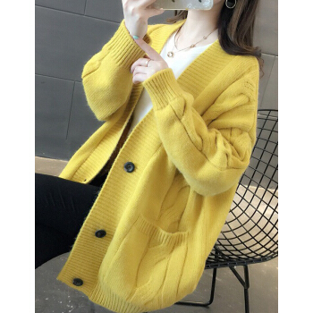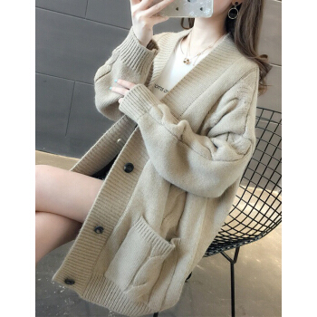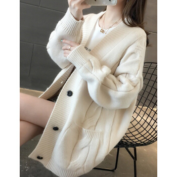 婪澈长袖针织衫女春秋新款女装韩版慵懒风V领中长款麻花针织衫宽松女开衫百搭毛衣外套 米白色 L |