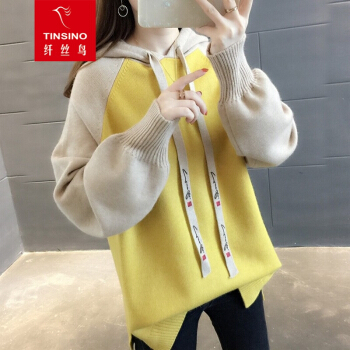 纤丝鸟 TINSINO 针织衫女秋冬新品拼色连帽针织毛衣女韩版宽松休闲上衣外套 黄色 请拍正确尺码 |
